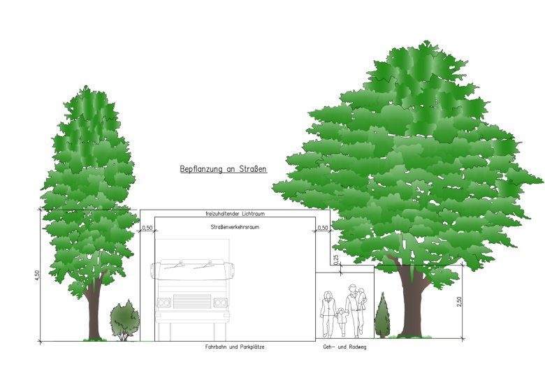 Die Grundstückseigentümer haben dafür Sorge zu tragen, dass keine überhängenden Äste, Zweige etc. in den öffentlichen Verkehrsraum hineinragen. Über der Straße bzw. Fahrbahn (auch Parkplätzen und Feuerwehrzufahrten!) muss ein freier Lichtraum von 4,50 Metern gegeben sein. Auf 2,50 Meter reduziert sich dieser frei zu haltende Lichtraum über Bürgersteigen und Rad- / Gehwegen. Der Lichtstrahl der Straßenbeleuchtung muss ungehindert die öffentlichen Flächen erreichen. Verkehrszeichen müssen freigeschnitten und erkennbar sein.