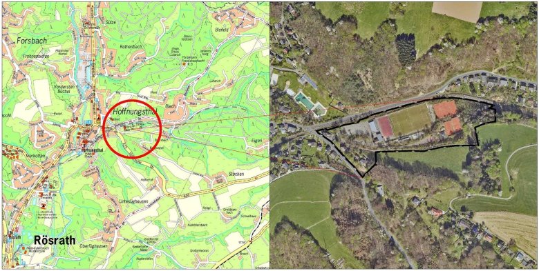 Luftbild: Geobasisdaten der Kommunen und des Landes NRW © Geobasis NRW, 202205/2025: Der Rat der Stadt Rösrath hat beschlossen, den Bebauungsplan Nr. 135 "Sportanlagen Bergsegen" aufzustellen.