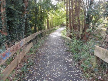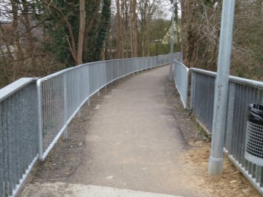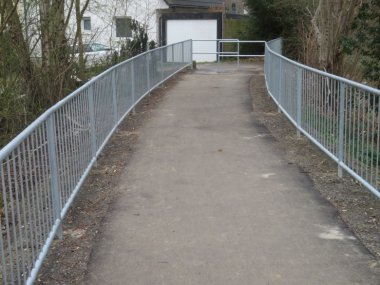 Nach Umbaumaßnahme Absturzsicherung durch neues Geländer zu den Bahngleisen hin.Mittlerer Abschnitt des Geh- und Radweges